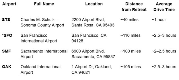 The San Francisco International Airport (SFO), Sacramento International Airport (SMF) and Oakland International Airport (OAK) are also options; however, public transportation from these airports to Santa Rosa will be necessary. See the next drop down for more information.
